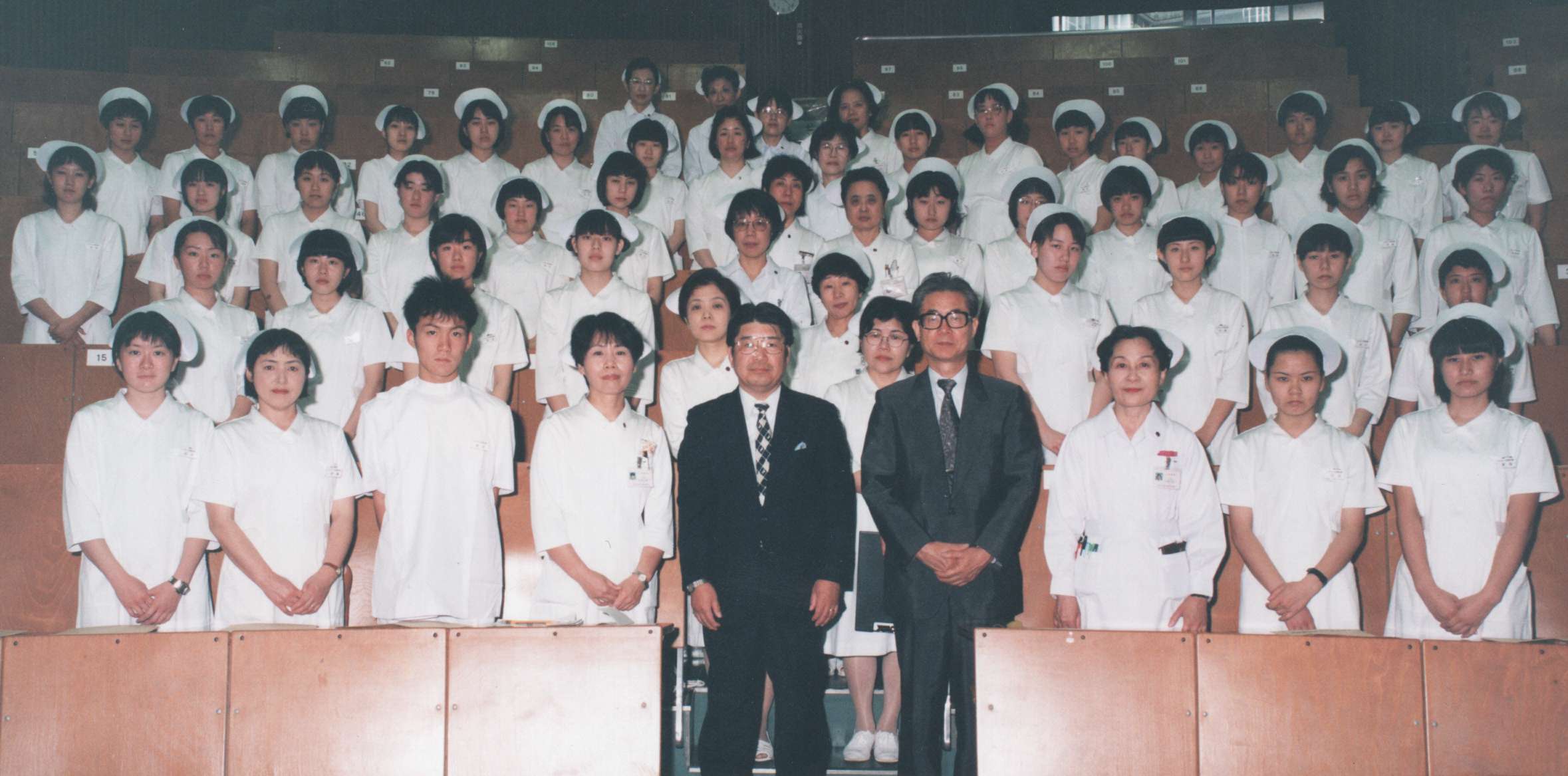 医学部附属病院が「ふれあい看護体験」を実施 5月11日,医学部附属病院は看護の日にちなんで第2回の「ふれあい看護体験」を実施しました。これは,看護を志す人や看護に関心ある高校生,主婦などが実際に病院で看護を体験する企画です。41名の参加者は10の病棟に別れて食事の介助や自らも病院給食を体験したり,午後は車椅子の患者さんとの散歩や部分清拭,足浴,参加者同士での血圧測定などをして,一日看護婦(士)の修了証を贈られました。 写真の説明 参加者と仁保病院長(中央右)と谷口事務部長(同左)