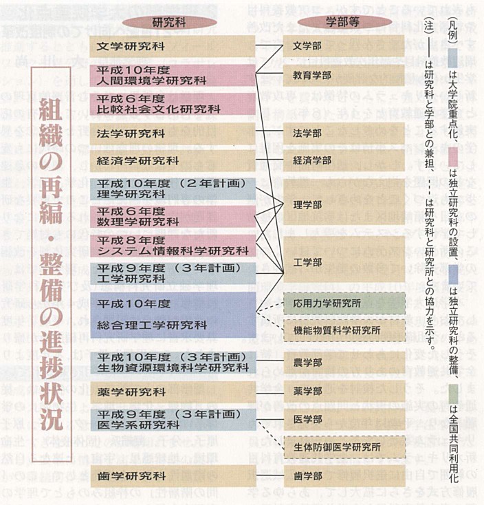 さらに,従来教官の所属する講座が,学士課程教育組織である「学部」にあったのを,「大学院研究科」に移すことにより,大学院教育の整備・充実を図る,いわゆる「大学院重点化」が,各部局において順調に進行し,医学部→医学系研究科と工学部→工学研究科(平成9年度から),理学部→理学研究科と農学部→生物資源環境科学研究科(平成10年度から)がそれぞれ開始された。これによって,10学部のうち教育学部を含む5学部で「大学院重点化」が実現しつつあり,これらの部局では,大胆な研究科や学部組織の再編・整備,カリキュラム改革が進んでいる。残る,文学部・法学部・経済学部・歯学部・薬学部においても「大学院重点化」に向けた改革への真剣な模索が続いている。