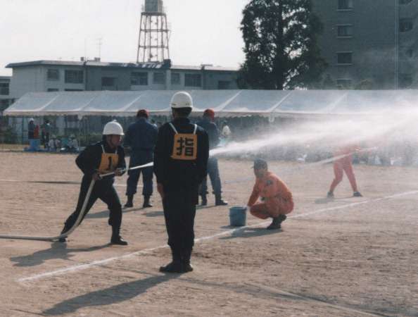 競技は,屋内消火栓設備を迅速かつ確実・安全に使用できるよう,操作技術の習熟を図る目的で行われ,指揮者の「操作始め」の号令を受けた後,放水線の前方8メートルの標的を30秒以内で落下させるもので,安全・確実・迅速に重点をおいて,操作技術の審査が行われました。