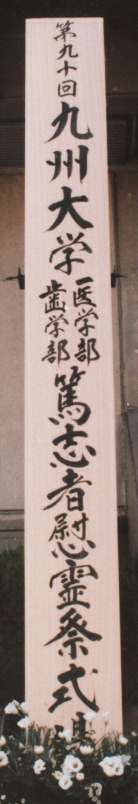 慰霊祭は,学生による献灯・献花で始まり,過去1年の篤志献体者を奉書した「光霊簿」が祭壇に奉納され,大学を代表して杉町医学部長,田中歯学部長代理及び献体団体の九大白菊会理事長からの追悼の辞と続きました。また,学生代表の「慰霊の辞」朗読では,献体者並びにその遺族への限りない感謝と,自らの医学に対する決意が述べられました。