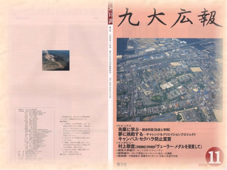 「九大広報」も第3号となりました。今回はトピックスで3つのものを取り上げております。 トピックスの内容は, 九大出身の先輩達などの講師による授業「総合科目【社会と学問】」 自分の夢に挑戦する「チャレンジ&クリエイションプロジェクト」 セクシュアル・ハラスメント防止に関する「キャンパス・セクハラ防止宣言」 です。 その他色々な記事があります。左の一覧のお読みになりたい記事からどうぞ....。