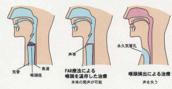 そのため早期の喉頭癌では放射線治療が行われるが,本学耳鼻咽喉科では放射線治療に抗癌剤5-FUとビタミンAを併用したFAR療法を開発し,治療効果を高めることができた。元来,喉頭を摘出し声を失っていたような患者さんが,FAR療法により喉頭(声)を温存したまま癌を治し社会復帰している姿を見るのは,医師としての喜びの一つである。