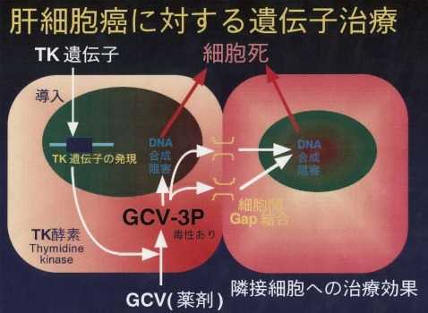 医学部教授 杉町 圭藏遺伝子研究が進み,癌は遺伝子の病気であることが分かってきました。我々の研究室では癌に対する遺伝子治療の研究を行っており,肝癌に対する自殺遺伝子を用いた遺伝子治療もそのうちの1つです。図1のように,癌細胞に特殊な酵素の遺伝子(TK)を導入すると,酵素が発現し,ガンシクロビル(GCV)という薬剤を細胞にとって極めて毒性の強い物質に変換し,細胞死に陥ります。