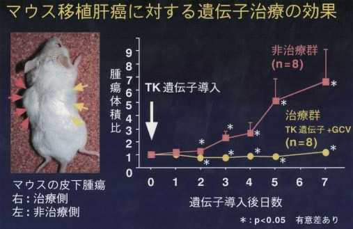 1つのがん細胞に遺伝子導入を行うと,その隣の細胞にも毒性物質は移行し,相乗効果が得られます。マウスの皮下に移植した肝細胞癌の実験では図2の如く,遺伝子治療により腫瘍の発育が抑えられています。今後は臨床への応用が期待されます。