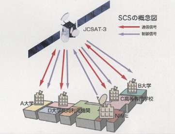 SCS(Space Collaboration System)は21世紀のマルチメディア社会にふさわしい高等教育システムとして,文部省メディア教育開発センターが開発した映像交換を中心とした衛星通信ネットワークシステムで,全国の大学等を結び,新しい遠隔教育のツールとして教育面のみならず研究交流などの面で有効に活用されています。現在,116機関,139局が整備されています。